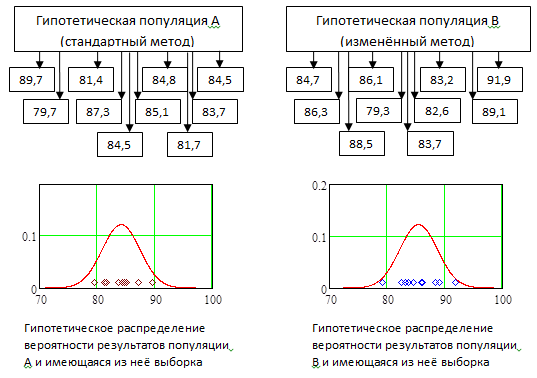 Обычно полагается, что набор данных, например, 10 результатов производственного эксперимента по методу А могут рассматриваться в виде случайной выборки из всей популяции полученных этим методом результатов. Для изображения предполагаемого вообразим, что десятки тысяч результатов выхода вещества, полученных стандартным методом А производства, записаны на билетах и помещены в большой лотерейный барабан, что схематично показано на Рис.10.1.4. Распределение вероятности этой очень большой популяции результатов представлено графиком функции плотности вероятности в нижней части того же рисунка. При справедливости гипотезы случайного выбора, 10 результатов по методу А представляются как 10 независимых случайных извлечений из лотерейного барабана А и, следовательно, из распределения А. Таким же образом результаты при изменённом методе В представляются как 10 независимых случайных извлечений из лотерейного барабана В и, следовательно, из распределения В.