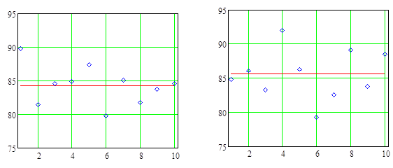 Почему хорошо, если можно считать верной гипотезу случайного выбора? Верность допущения, что данные могут быть представлены в виде случайных выборок, значит, что переменные у1, у2,..., у10 и у11, у12,..., у20 распределены независимо около соответствующих их средних yA и yВ. Отсюда ошибки у1–yA, у2–yA, ..., у10–yA, у11–yВ, у12–yВ, ..., у20–yВ переменных у1, у2,..., у10,..., у20 полагается, что изменяются независимо одна от другой и, в частности, порядок в котором проводятся опыты не имеет влияния на результаты.