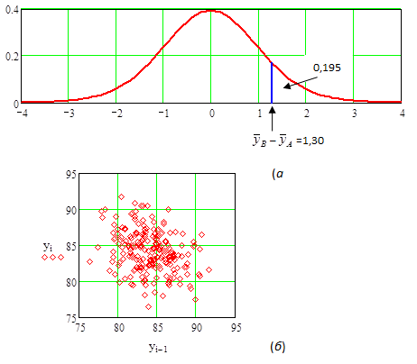 Рис.10.1.6. (a) Основанное на допущении случайного выбора внутренних данных распределение t для сравнения, (б) График зависимости уt+1 от уt для 210 результатов, показывющий оцениваемую корреляцию (автокорреляция при отставании)