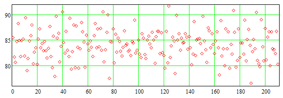 Для полученных одно за другим 210 результатов, являющихся временным рядом и на основе которых найдено внешнее распределение для сравнения, оценка коэффициента автокорреляции при отставании 1, в силу (1.8.5), находится по формуле