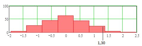 Рис.10.1.3. Гистограмма распределения 191 разности между усреднёнными значениями смежных 10 результатов по методу А.