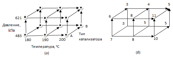 На Рис.11.1(а) план эксперимента с тремя влияющими на отклик переменными изображён графически. По этому плану переменная Температура устанавливается в опытах при трёх значениях, а переменная Давление - на двух значениях. Переменная Катализатор нечисловая и используется в двух вариантах. Поэтому для проведения эксперимента по этому плану выбраны следующие их значения и варианты: