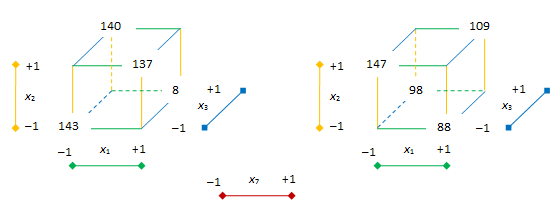 | 7 | –1 | +1 | +1 | –1 | –1 | +1 | –1 | 142 | 135 | 144 | 140 |