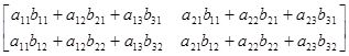 что является суммой произведений элементов i-й строки матрицы A на соответствующие элементы j-го столбца матрицы B. Таким образом, каждая строка матрицы A умножается на каждый столбец матрицы B. Если матрица A размеров nxm и матрица В размеров mxp, то матрица С=АВ получается размеров nxр. Покажем умножение матриц на следующем примере.