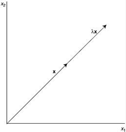 где l - собственное значение матрицы А и х - её собственный вектор. (Иногда их называют характеристическими значением и вектором.) Выражение (П.12.1) называется уравнением собственных значений-векторов матрицы А. Заметим, что в нём вектор х преобразуется матрицей А в кратное самому себе, так что вектор Ах находится на линии, проходящей по вектору х из начала координат, как показано на рисунке П.12.