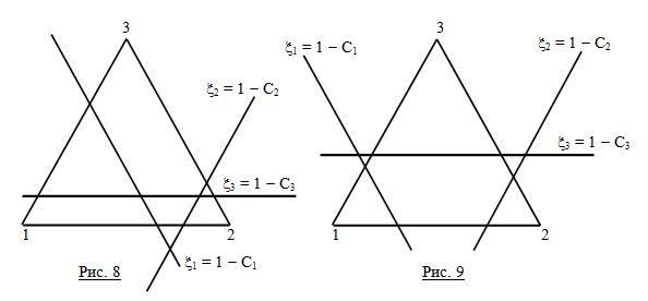 В этом случае с-ядро представлено на рис.7 в виде заштрихованного треугольника внутри основного треугольника. Аналогично рассматриваются остальные возможные варианты сочета- ний неравенств. Например, если С1 + С2 < 1, то с-ядро имеет вид заштрихованного четырёх- угольника внутри основного треугольника (рис.8). Вообще многогранник, представляющий с‑ядро, образуется как выпуклый многогранник пересечением прямых (11) и строк основного треугольника. Если, например, выполняются неравенства