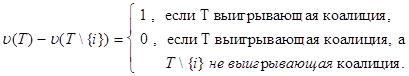 где суммирование по T распространяется на все такие выигрывающие коалиции T, что коалиция T {i}не является выигрывающей.