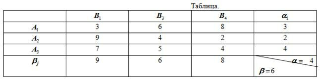 2. Определить верхнюю и нижнюю цены игры и проверить, имеет ли игра седловую точку. Если седловая точка есть, то соответствующие ей стратегии игроков будут оптимальными, а цена совпадает с верхней (нижней) ценой.