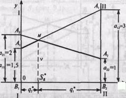 , а ордината — цену игры v. Точка N является точкой пересечения прямых