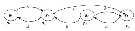 Граф переходов для этого процесса приведен на рис. 3. В диаграмму переходов не включены петли, ведущие из состояния Ei, i=0,3, обратно в это же состояние, так как, согласно (14), члены на главной диагонали матрицы Q не содержат никакой новой информации: они равны сумме элементов соответствующей строки, взятой со знаком минус.