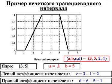 Понятие коэффициентов нечеткости. Коэффициенты нечеткости являются средством описания нечетких чисел и интервалов. Они характеризуют степень размытости границ соответствующих нечетких множеств. Для задания любого нечеткого множества необходимо иметь описания: