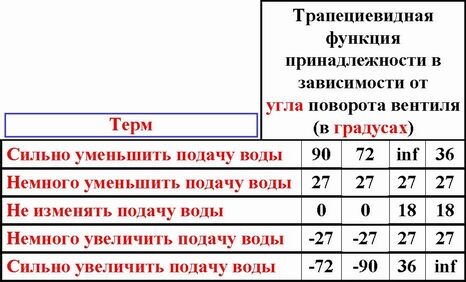 Дефаззификация величины (13.5, 13.5, 22.5, 22.5) дает приблизительный результат: угол поворота вентиля крана = 13.5°.