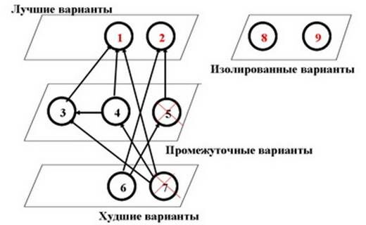 3. Для качественного порядка: из каждого варианта категорий в) и г) обязательно существует дуга к какому либо из лучших вариантов.