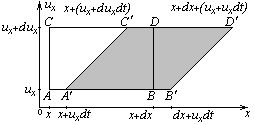 Покажем, что фазовый объем в нашем случае не изменяется. Для этого рассмотрим сначала, как изменяется проекция фазового объема. В момент t+dt точки A,B,C,D передвинутся. Нетрудно видеть, что получится параллелограмм, верхнее и нижнее основания которого равны dx, а высота dux. Площадь этого параллелограмма будет по-прежнему duxdx, то есть