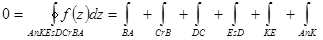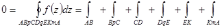 | Соединим контуры линиями AB, CD, EK. По интегральной теореме Коши интегралы по контуру AbpCDqEKmA и по контуру AnKEsDCrBA равны нулю. Представим эти интегралы как сумму интегралов по составляющим контуры дугам и сложим эти интегралы, сокращая интегралы по одним и тем же дугам в разных направлениях |