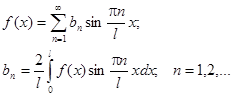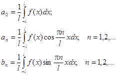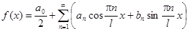 Ряд Фурье для функции f(x) периода Т = 2l, непрерывной или имеющей конечное число точек разрыва первого рода на отрезке [-l, l] имеет вид: