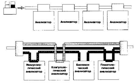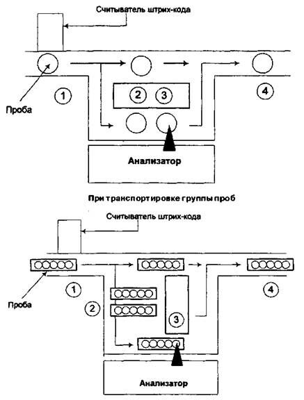 ЛАС могут осуществлять не только подготовку доставленного в лабораторию биоматериала, но и транспортировку его к анализаторам. На рис. 2. представлен принцип организации системы транспортирования проб в ЛАС "CLINILOG" корпорации "А&Т" (в верхней части рисунка линия транспортировки для одного типа проб, в нижней для различных типов проб).