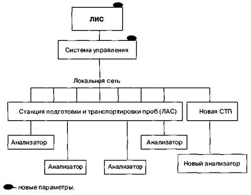 На рис. 9 изображено подключение нового анализатора в состав ЛАС при последовательном методе, при котором обеспечивается новый фрагмент системы транспортировки проб для нового анализатора, а в системе управления ЛАС и лабораторной информационной системе описываются данные нового анализатора как параметрическая настройка, т.е. без программирования, и подключение может быть выполнено сотрудниками, занимающимися ежедневной эксплуатацией системы, без привлечения специально подготовленного персонала.