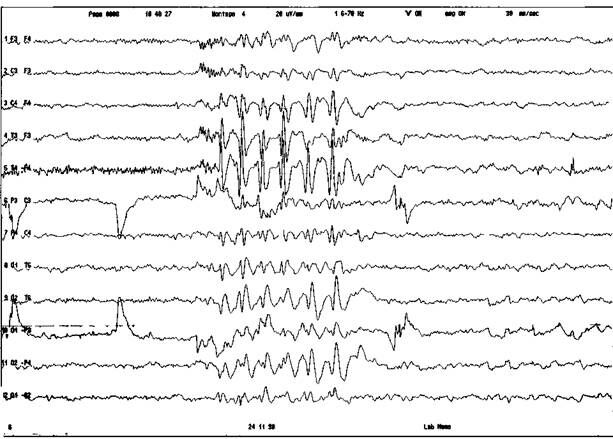 Характерны изменения ЭЭГ. На ЭЭГ типичные роландические спайки сочетаются с другими формами эпиактивности, в частности, с медленными комплексами пик-волна, характерными для синдрома Леннокса-Гасто, или нерегулярной генерализованной пик-волновой активностью частоты обычно менее 2,5 Гц с амплитудным региональным преобладанием и включением комплексов типа "роландических" (рис. 12.5).