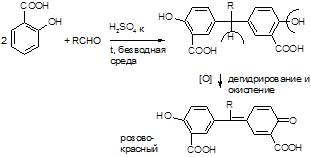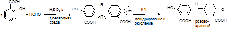 В результате реакции получается ауриновый краситель розово-красного цвета.