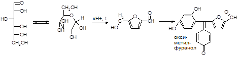 1) Конденсация с тимолом (с кH2SO4) à темно-красное окрашивание.