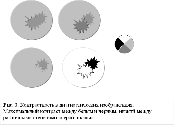 К основным характеристикам диагностических изображений относятся контрастность и пространственное разрешение[vi] (табл. 2). Последнее показывает, сколько деталей на протяжении 1 мм можно раздельно различить в данном изображении (чем выше пространственное разрешение, тем более мелкие детали возможно распознать)[11]. Эта основополагающая характеристика прямо зависит от степени контрастности изучаемых деталей. Контрастность (контраст) – это разница в яркости детали и фона или между двумя деталями (рис. 3, 4). В свою очередь, контрастность прямо пропорциональна плотности изучаемого объекта (если между тканями нет достаточной разницы в плотности, то они окажутся неотличимыми, как бы высоко ни было пространственное разрешение)[12]. В том случае, если естественного контраста недостаточно, прибегают к искусственному контрастированию (введение в организм исследуемого веществ и сред, изменяющих физические свойства тканей). Контрастные средства изменяют плотность тканей или полостей тела, в которых они накапливаются.