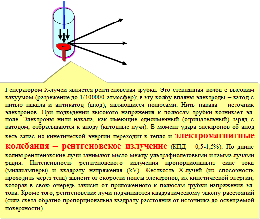 [i] Х-лучи были открыты профессором физики Вюртцбургского университета Вильгельмом Конрадом Рентгеном 8 ноября 1895 года. При пропускании эл. тока высокого напряжения через вакуумную трубку возникает поток электронов, который, встречая на своем пути препятствие, тормозится и тем вызывает возникновение электромагнитных колебаний большой частоты. Эти электромагнитные колебания и являются рентгеновскими лучами.