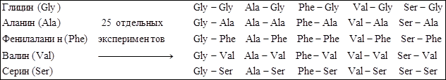 Для примера, предположим, что мы хотим синтезировать все возможные дипептиды из пяти различных аминокислот. Используя традиционную химию их можно получать по одному. Таким образом, 25 возможных дипептидов будут получены в 25 отдельных экспериментах.