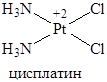 Цисплатин представляет собой плоский комплекс с центральным атомом платины, окруженным двумя лабильными атомами хлора и двумя относительно инертными аммониевыми фрагментами в цис‑конфигурации.