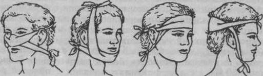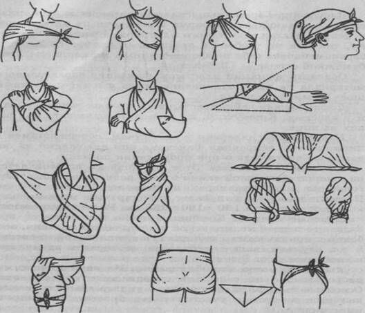 - приложить Т-образную повязку (прикрепить один конец полосы марли к поясу, другой конец разрезать вдоль на две полоски);