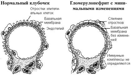 Гломерулярная болезнь с минимальными изменениями (идиопатический нефротический синдром) наиболее часто развивается у детей в возрасте до 8 лет (80%) и редко у взрослых и сопровождается нефротическим синдромом. Пик заболеваемости лежит между 2 и 4 годами. Чаще болеют мальчики. Это заболевание также известно под названием липоидный нефрит, т.к. при нем часто в клетках канальцев обнаруживаются жиры, что является наиболее значимым микроскопическим признаком.