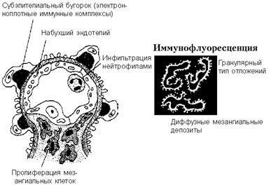 Повреждения, вызванные иммунными комплексами, приводит к развитию различных реакций в клубочках, которые зависят от природы иммунных комплексов. Это повреждение может проявляться в виде диффузного либо фокального пролиферативного гломерулонефрита.