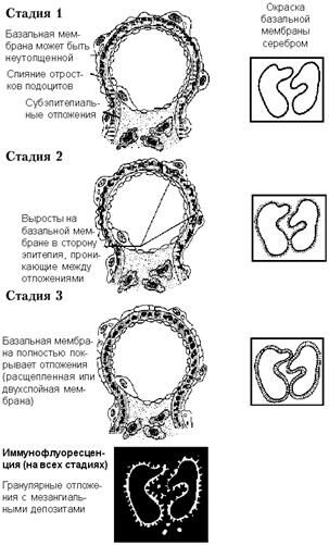 На стадии III выросты увеличиваются и сливаются с эпителиальной стороны отложений; при окраске серебром базальная мембрана выглядит расщепленной, двухслойной, слои которой соединены выростами (это создает картину цепи, где неокрашенные зоны представляют собой отложения иммунных комплексов). На этой стадии при обычной световой микроскопии обнаруживается утолщение базальной мембраны.