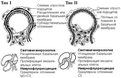 МПГН не является диагностическим маркером для одного заболевания; это только определение конкретного типа поражения почек при воздействии различных факторов. Он был впервые описан в 1965 году, при этом были выделены два основных типа (рис. 5); через 10 лет был описан редко встречающийся третий тип, но он не имеет особых клинических проявлений.