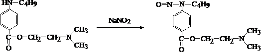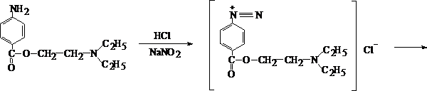 К исследуемому раствору прибавляют 1% раствор хлороводородной кислоты, а затем по каплям 1% раствор натрия нитрита до тех пор, пока не начнёт окрашиваться в синий цвет йодкрахмальная бумажка. Через 5 мин жидкость подщелачивают 2% раствором едкого натра до щелочной реакции и прибавляют щелочной раствор b–нафтола. При наличии новокаина раствор приобретает красно–оранжевую окраску.