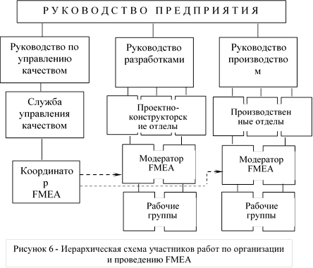 Предприятия, берущие за основу деятельности современные методы обеспечения качества и конкурентоспособности, обычно имеют в службе "Управления качеством" специально подготовленного координатора, наделенного полномочиями по определению места и задач проведения FMEA, планированию и координации проектов FMEA, обеспечению методическими указаниями и решению вопросов проведения соответствующего обучения. При этом рекомендуется [4] следующая схема.