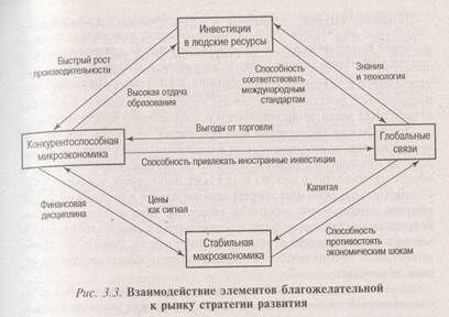 На рис. 3.3 показаны отношения между государством и рынком в четырех аспектах: развитие человека, внутренняя экономика, международная экономика и макроэкономическая политика. Эти сферы деятельности взаимосвязаны. Внутренняя экономика без чрезмерных «перекосов» вознаграждает тех, кто формирует свой человеческий капитал более бережно, чем это делает «перекошенная» экономика. В то же время образование делает внутреннюю экономику более производительной благодаря тому, что ускоряется освоение новых технологий. Или другой пример: стабильная макроэкономика помогает внутренней системе цен, поскольку она рассеивает туман инфляции. Но эффективность микроэкономики также облегчает возможность поддерживать инфляцию на низком уровне: чем меньше нежизнеспособных предприятий, тем меньше потребность в субсидиях, усиливающих дефицит государственного сектора. Все четыре направления деятельности по праву заслуживают того, чтобы ими заниматься. Однако ввиду существования таких связей результаты, по-видимому, будут несоизмеримо более надежными, если все они будут осуществляться вместе.