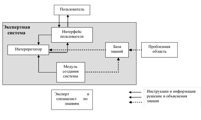 Основными компонентами информационной технологии, используемой в экспертной системе, являются (рис. 3.17): интерфейс пользователя, база знаний, интерпретатор, модуль создания системы.