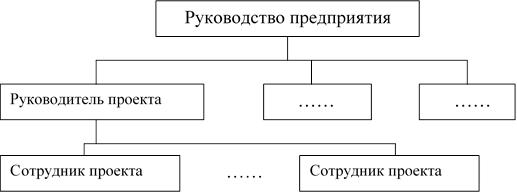 При типовой организации менеджмента руководитель проекта единолично несет ответственность за его выполнение. Проектное подразделение в значительной мере изолировано от структуры предприятия, связь с другими подразделениями осуществляется через высшее руководство предприятия.