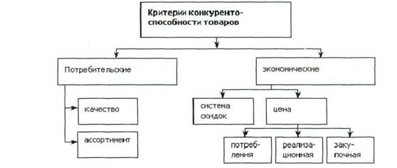 Важнейшим экономическим критерием конкурентоспособности товаров является цена; Для разных категорий потребителей и групп товаров конкурентоспособность обеспечивается различными видами цен: закупочными, реализационными и потребления.