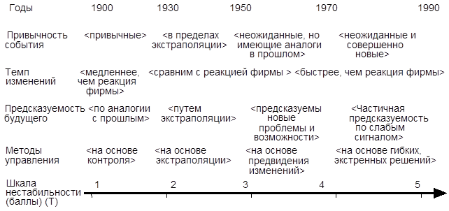 Видно, что основная тенденция развития мирового рынка состоит в непрерывном увеличении его изменчивости и нестабильности. Недаром в качестве некой обобщенной меры состояния рынка на диаграмме приведена шкала нестабильности в баллах, где большее количество баллов соответствует повышению уровня нестабильности. Эта шкала приведена здесь в связи с тем, что и сегодня ряд предприятий и отраслей могут работать в условиях относительной стабильности (газовая, нефтяная, лесная промышленность - индекс 2-2, 5), а другие - в обстановке большой нестабильности (радиотехническая, автомобильная-соответствующий индекс 4-5).