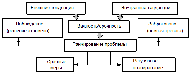 | 1. Опасность или новая возможность осознаются | Наблюдение за внешней средой Определение относительной силы слабых сигналов |