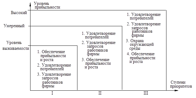 Хотя среди целей получение прибыли имеет ключевое значение, однако приоритеты целей могут определяться и уровнем прибыльности фирмы (рис. 64).