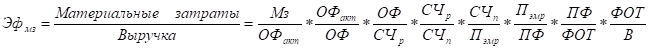 Примером мультипликативной модели эффективности производства может выступить модель, построенная на базе показателя, представляющего собой отношение материальных затрат к выручке от реализации. В качестве неявных факторов использованы следующие: