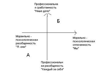Сектор «Б» свидетельствует о высоком уровне развития профессиональной группы, а сектор «А» - о низком ее развитии. В первом случае речь может идти о коллективистских ценностных ориентациях в совместной деятельности профессионалов, а во втором – об индивидуалистических ориентациях работников.