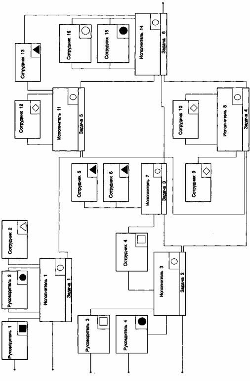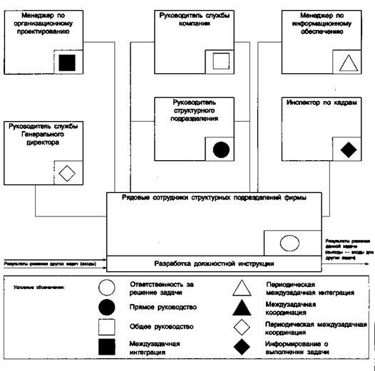 На этой схеме задача «Разработка должностной инструкции» однозначно связывается с различными исполнителями этой задачи. Распределение обязанностей по этой задаче отображается с помощью условных обозначений.