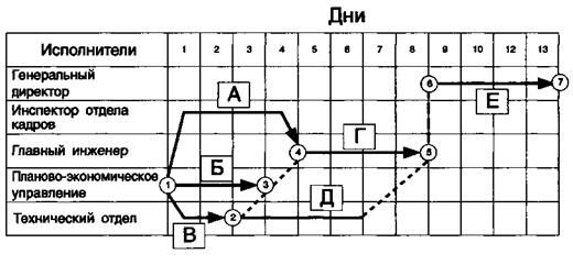 На рисунке 7.13. представлен пример сетевой матрицы. Сплошными линиями изображаются работы (если используется сеть «узел - событие»), пунктирной линией изображается ожидание (резерв) и штрих - пунктиром - зависимость, идущая по вертикали.