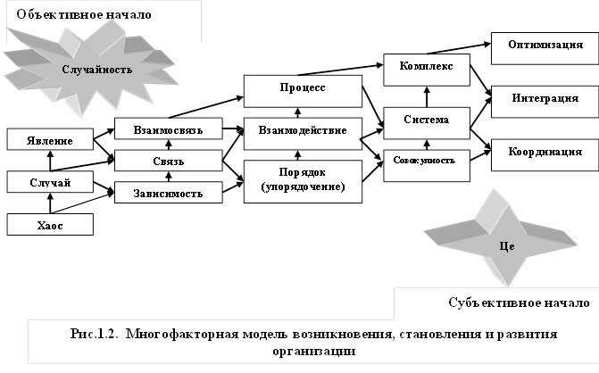 Реально действующая организация в лице человека или группы последовательно объединяет эти начала в смешанный объективно-субъективный процесс, результатом которого становится большинство существующих организаций. Поэтому, учитывая стадии возникновения, становления и развития организации, их можно объединить комплексно в виде многофакторной модели, отражающей последовательность, содержание и логику (см. рис. 1.2.).
