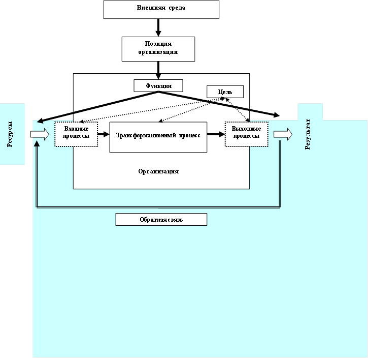 Потоково-процессная модель отражает открытый характер организации. Отличительной особенностью организационных систем такого рода является обмен с окружающей средой энергией и веществом. В рамках любой открытой системы, постоянно осуществляются процессы: входные (ресурсы, информация) – трансформационные процессы – выходные (готовый продукт, услуги, информация).