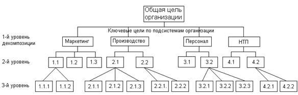 Количество уровней декомпозиции зависит от масштабов и сложности поставленных целей, от принятой в организации структуры, от иерархичности построения ее менеджмента.